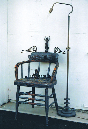 39” x 24” x 17”. This sculpture is a saloon-type chair, on which has been applied a figurine, ornamental brass and other metallic fixtures; cartridge casings of various calibers; watch parts; a copper mold of a child’s hand; lead wrappings and leaf-like shapes; escutcheon pins; and finishing nails.