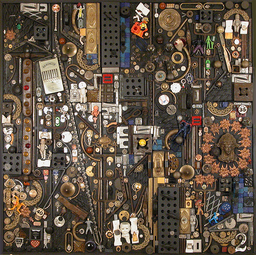 41” x 41” x 4”. Metal, plastic, aluminum, steel, rubber, iron, tin, glass, clay, and acrylic on wood. A composite of 1000’s of “found objects”, arranged in abstract patterns.