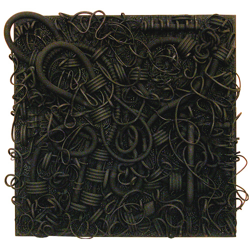 3-Dimensional 52” x 52” x 6”. Nails, hoses, cable, wiring, “found objects” on wood panel. Reminiscent of an intricate racing car engine, a structural symmetry is apparent in this complex, but interesting, interplay of hoses, cables, wires, nails, and assorted objects of cast iron, wiring, steel, plastic and rubber, all of which comprise “Pit Stop”. The linear juxtaposition, as well as spatial positioning of a vast assortment of objects, all of which suggest powerful forces at work, are projected 3-dimensionally.
