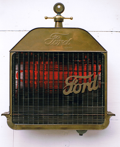 28” x 33” x 6”. 3-dimensional wall relief, incorporating an early 1900’s Model-T Ford radiator, grill assembly, and thermostat, with electric rope lighting.