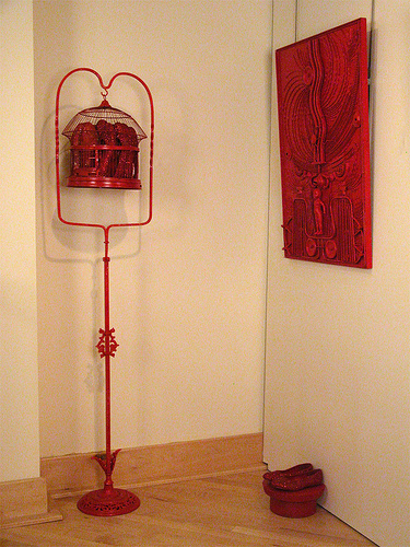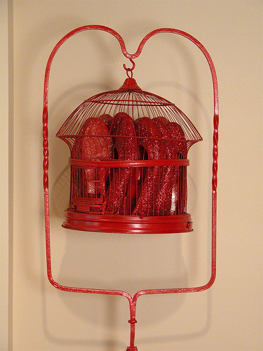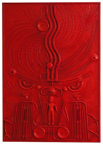 Wall relief on wood panel. 25” x 36” x 1”. An interesting parody on the popular children’s “classic”, “Dorothy and The Wizard of Ox”. A work made striking through the use of all red acrylic. Focus of the work is a “doll like” Dorothy; arms raised; and caught up in a vortex or “cyclone” of whirling wire shapes and patterns – symbolic of the cyclones of her native Kansas. An interesting counter-point to the work is the inclusion of a birdcage, containing all of Dorothy’s “red shoes”, which facilitated her return to her native Kansas, from the World of Oz.