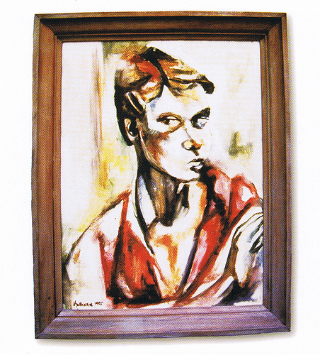 28" x 22" This painting is oil on a wooden panel, and was painted at age 19, while I was a student at Michigan State University. I had a 50 year retrospective at the Widener University Art Gallery PA in 2005 and this work started the retrospective, and another self portrait in India ink created at age 70 in 2005 ended the show.