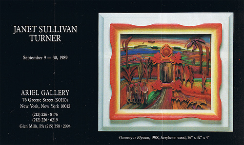 36” x 32” x 4”. 3-dimensional. Acrylic on wood. This painting was feature in a color advertisement appearing in the September 19189 issues of “Art in America”. It incorporates antique framery, as well as a Tramp Art Frame, in the center of the work. The painting is expressive of my interpretation of Greek mythology surrounding Elysium.