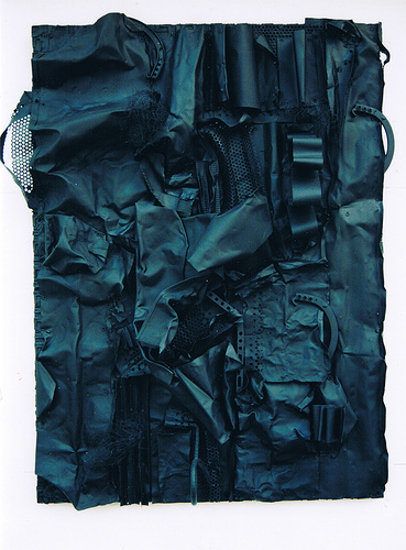 32” x 24” x 1”. Wall relief. Acrylic and various metals on wood. A collage of “silk and taffeta-like” metal; wire and screening – crumpled, twisted, and black lace in appearance.