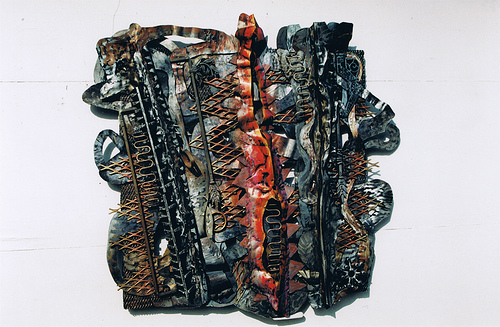 36” x 36” x 3”. Collage of steel; aluminum; mesh; ornamental and decorative “found objects”.