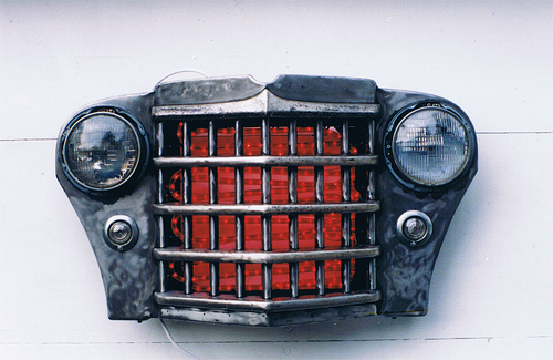 Metal wall relief. 39” x 22” x 9”. Work consists of the burnished grill of a Willy’s Jeep (of World War II vintage) in which red electric rope lights have been installed.