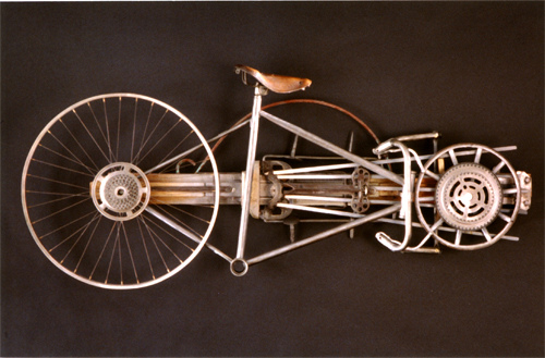 The artist’s statement of a premier bicycle race, run in Philadelphia, each year – bringing the world’s best cyclists together. Greatest challenge of the course is the “Manayunk Wall” a steep, and, seemingly endless, 30 degree ascent through the Manayunk neighborhood. The work represents a near-real interpretation of a bicycle “assemblage” in which wheels; gear assemblies; handle bars; a “French” bicycle seat; copper fasteners and cast-iron rods all interact in a manner suggestive of the “forces” at work in the cyclist’s arduous climb.